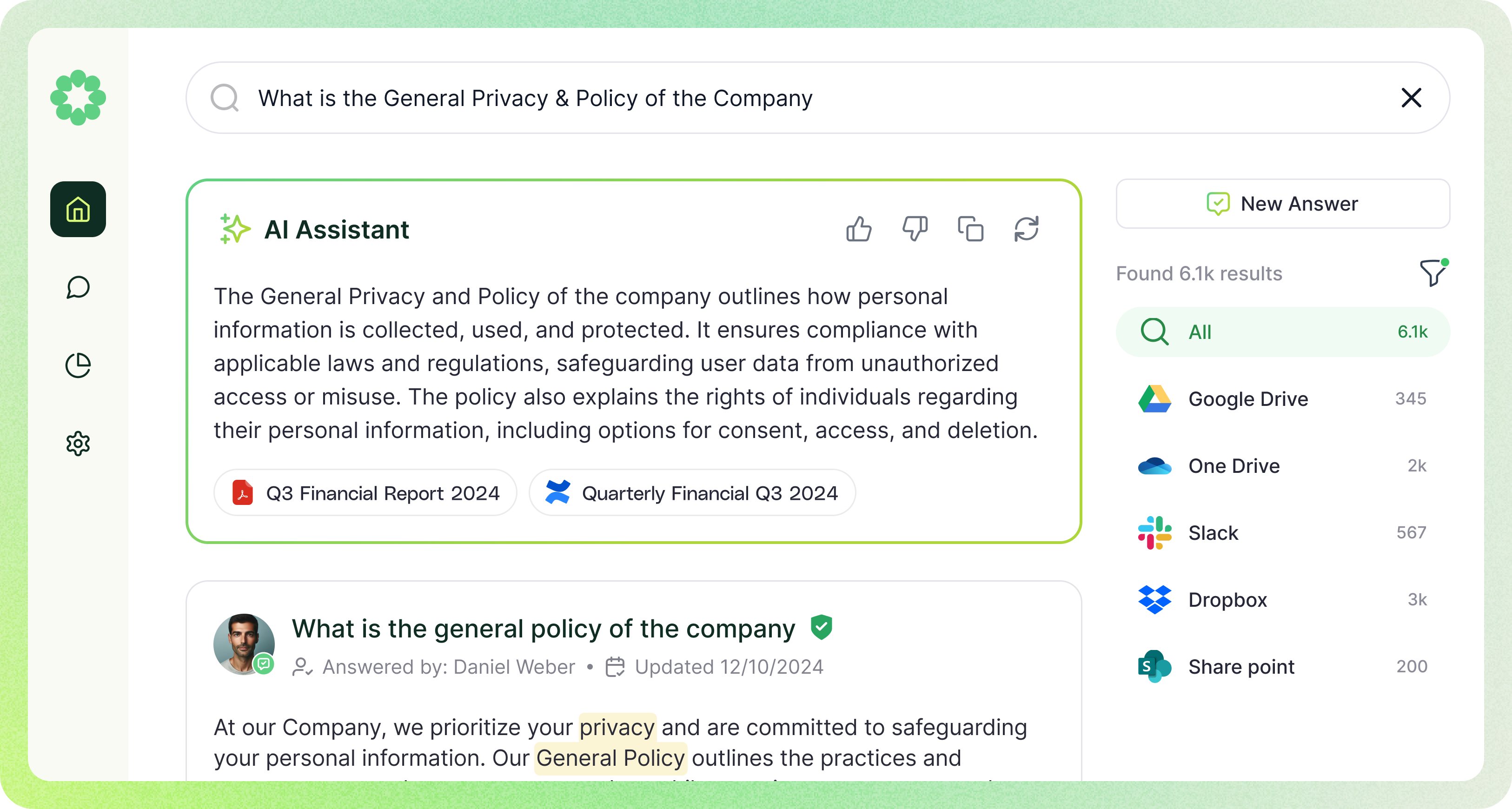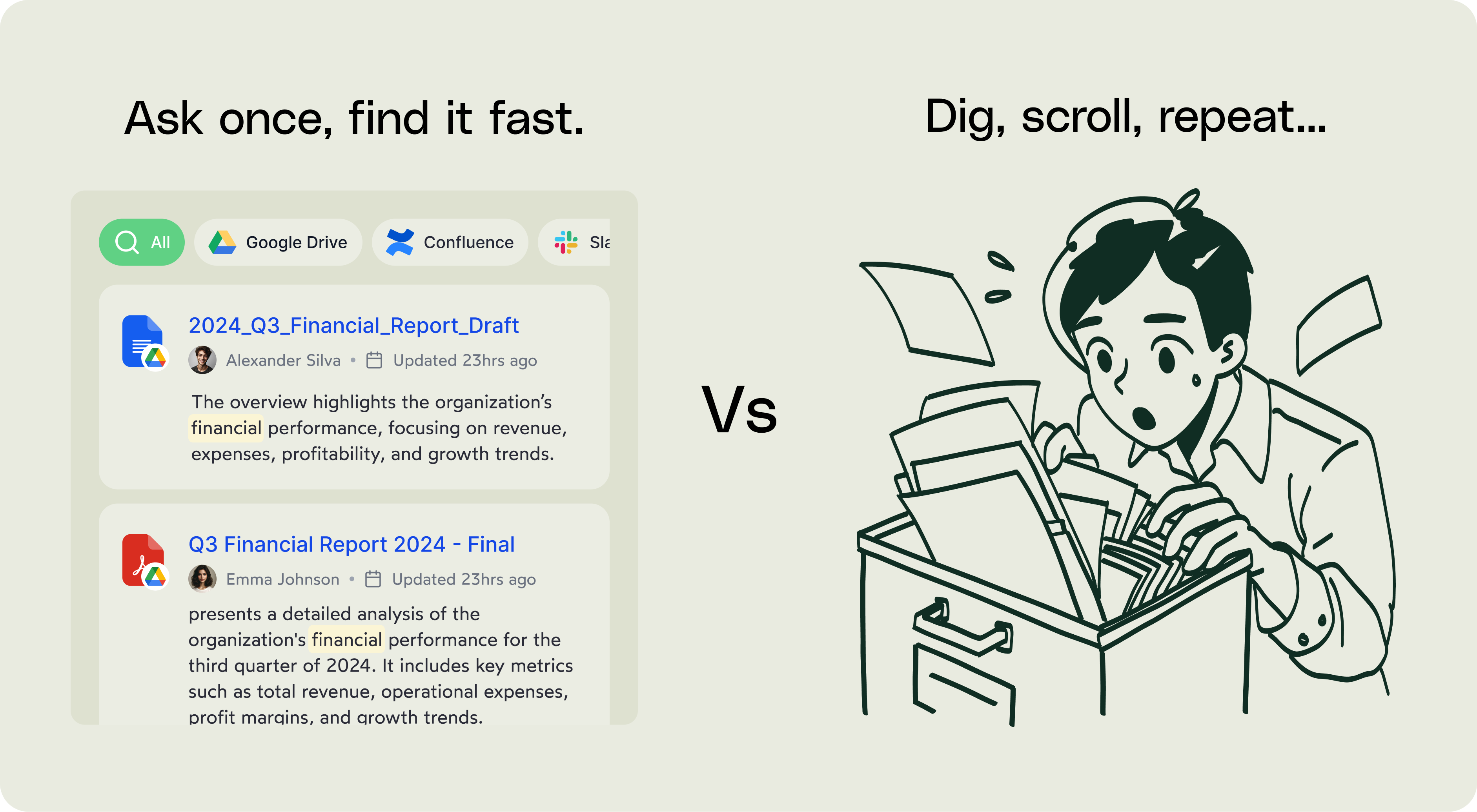 Many companies struggle with fragmented data scattered across multiple tools and systems, making it hard to find the right information quickly. Traditional search methods don’t understand context or meaning, so employees waste time hunting through documents, tickets, emails, and apps.