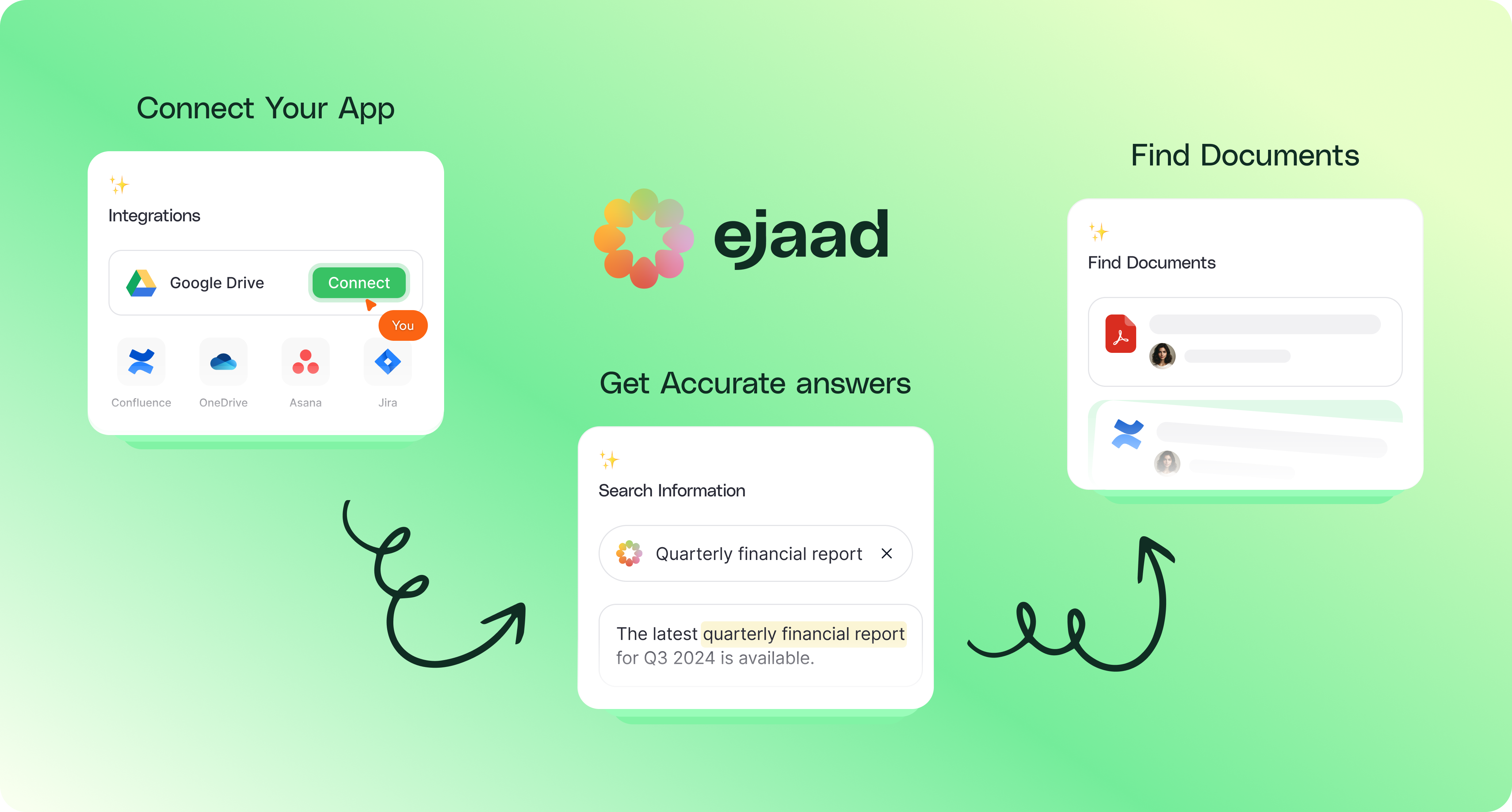 Ejaad helps you find exactly what you need — instantly. It searches across all your company’s tools and knowledge sources, delivering accurate, up-to-date answers instead of endless links. With AI-powered understanding, Ejaad goes beyond simple keywords to truly understand your questions and surface the right information every time.