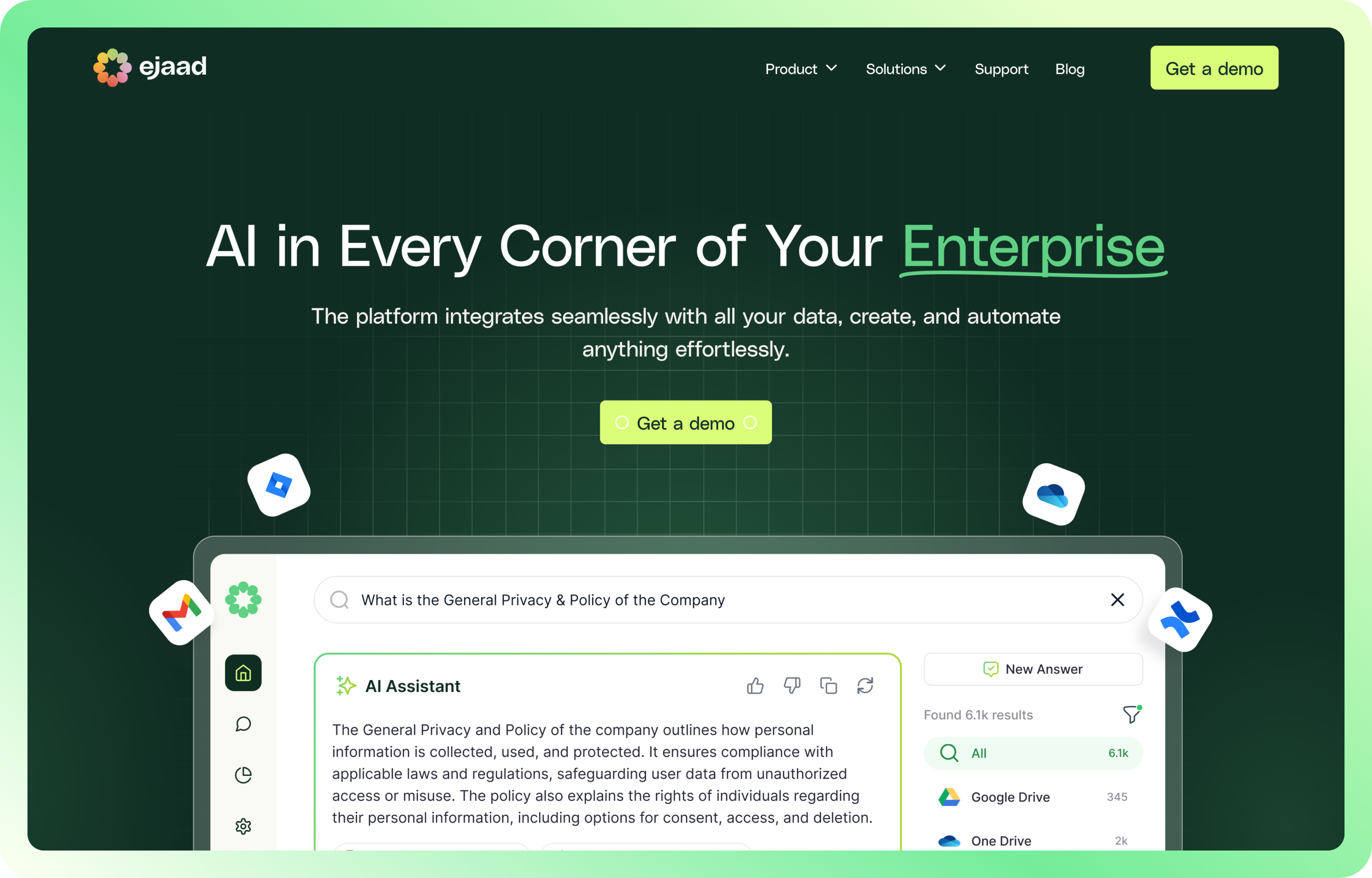 Ejaad AI is an enterprise search platform that helps companies find answers across all their data and apps. It uses advanced AI to deliver fast, accurate responses and connects with tools like Google Drive, Slack, and OneDrive to streamline workflows and boost efficiency.