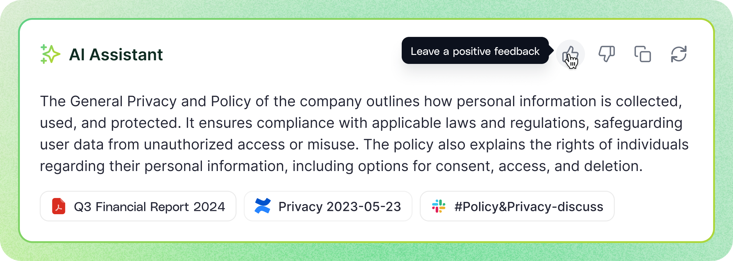 One of the most effective ways we measured the success of AI Answers was by adding Like and Dislike feedback buttons. During internal testing, we collected this feedback and shared it with the AI team to help improve the model’s performance.